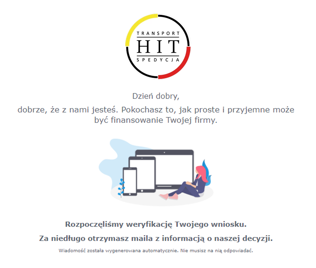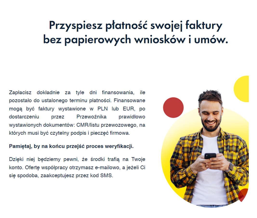 Otrzymujesz ofertę i akceptujesz ją kodem SMS. HiT Transpot potwierdza fakturę, a Ty otrzymujesz środki na swój rachunek bankowy!